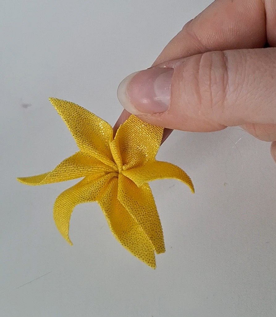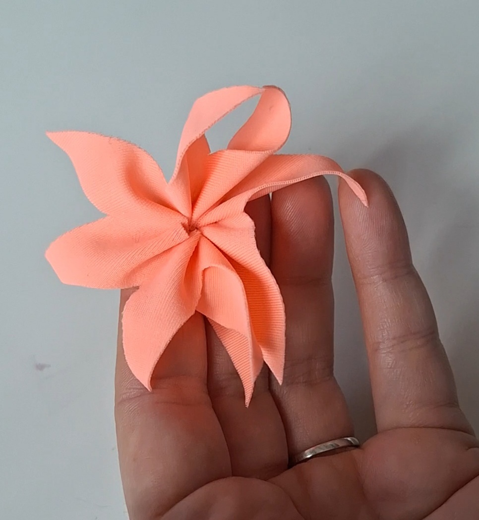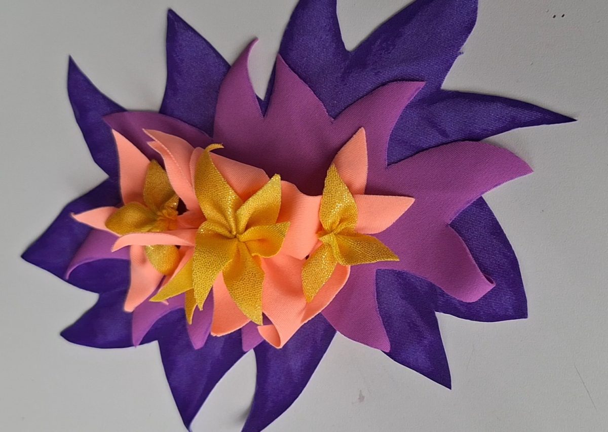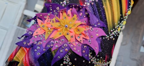 C’est un justaucorps que j’avais en tête depuis longtemps. Il me restait un bout de voile cuivre d’un de mes anciens justaucorps, qui était assez grand pour pouvoir imaginer un projet avec, mais avec très peu de marge. J’ai utilisé un mannequin pour mouler directement le drapé dessus. J’ai également refait les colliers de fleurs dans le dos, que j’avais déjà fait sur le justaucorps de ma fille. Un dos que je voulais absolument refaire, car je le trouve très élégant.