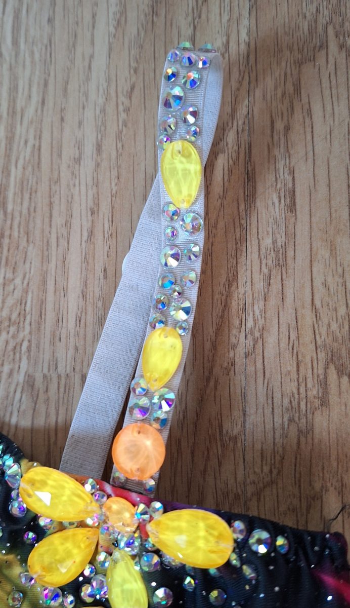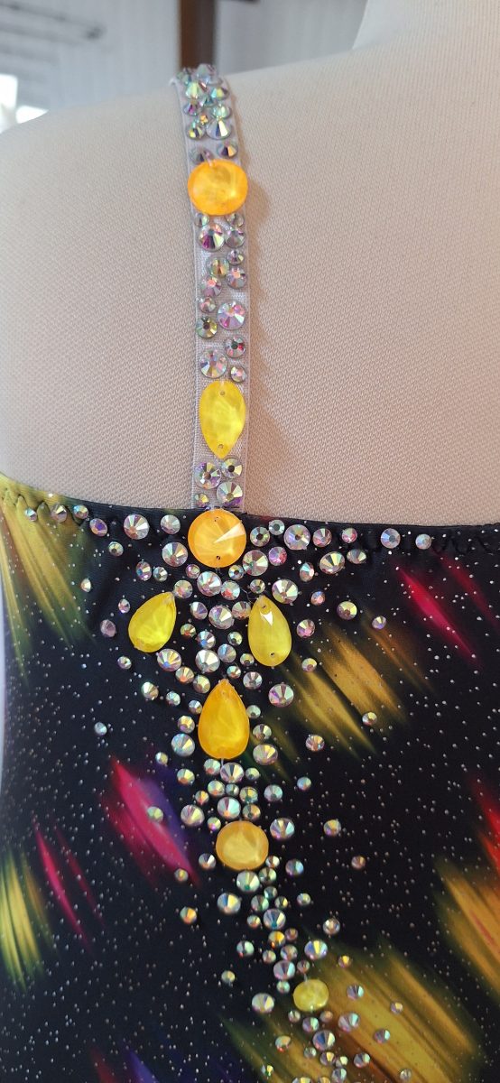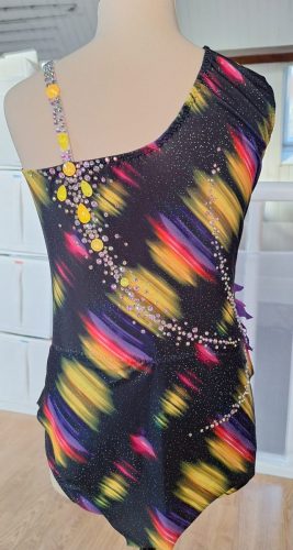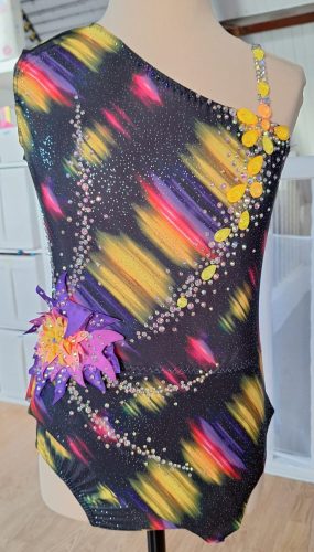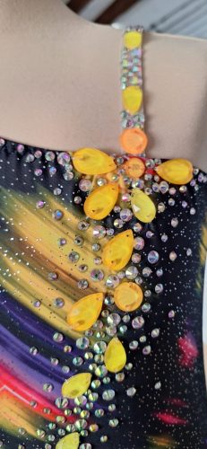 Justaucorps réalisé pour une gymnaste de mon club. Cela faisait longtemps que j’avais envie de créer un justaucorps avec au moins un côté entièrement recouvert de strass. Je ne lâche pas l’idée de faire un jour un justaucorps entièrement en strass !