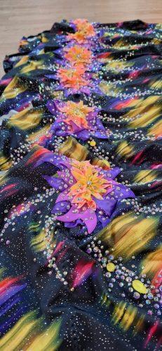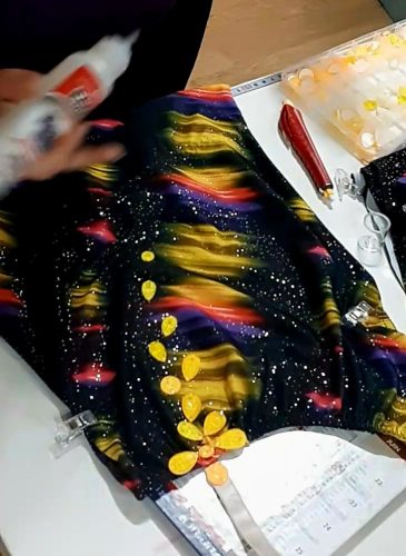 J’avais sous la main un tissu assez graphique, j’en ai fait des ceintures, recouvertes de strass de toutes les couleurs, j’ai rajouté une jupette asymétrique en voile noir, et également mis des strass noirs sur la base.